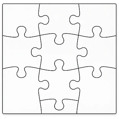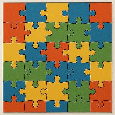 a person is surrounded by puzzle pieces, each representing a different aspect of their life (work, exercise, family, leisure), and healthy foods are integrated into each piece. The person assembles the puzzle, creating a complete, personalized nutrition plan. The mood is uplifting and creative. emoji