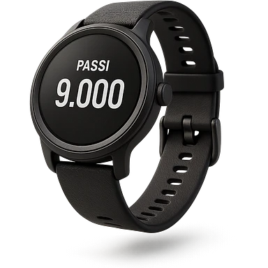 orologio contapassi che segna 9.000 passi sul display in italiano, fluttua in aria, iperrealistica 4k, isolato su sfondo bianco emoji