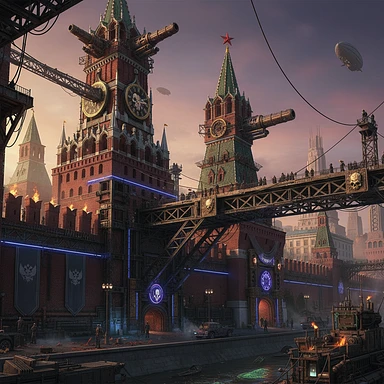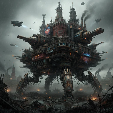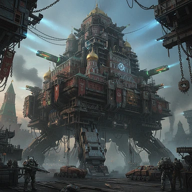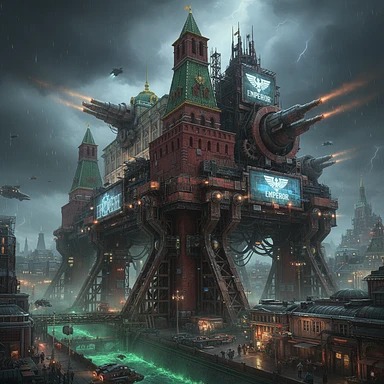 Московский Кремль, но на таких опорах и достройках, как будто его превращают в объект из Warhammer. Стиль ретрокиберпанк и Warhammer emoji