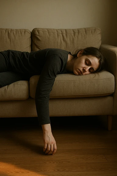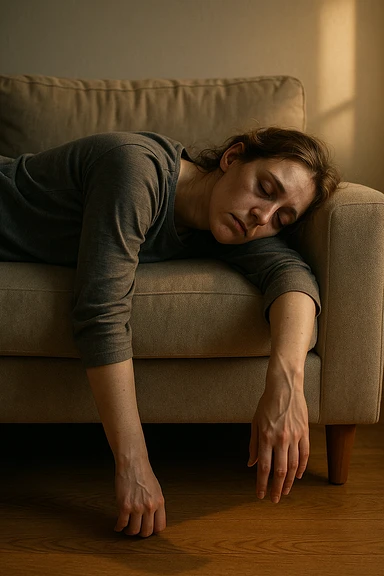 Empathetic photorealistic shot of a woman collapsed on a sofa, her body completely limp as if made of lead. One arm hangs off the edge, touching the floor. Her eyes are closed, face pale with dark circles. The afternoon light is warm but fails to energize the scene, emphasizing her profound exhaustion.image