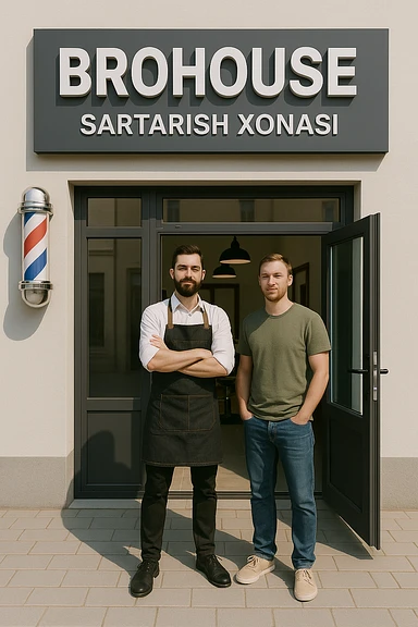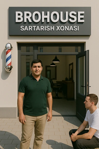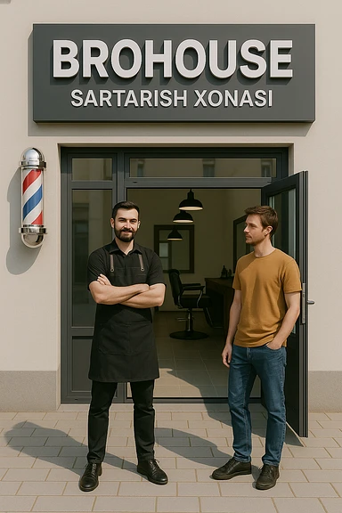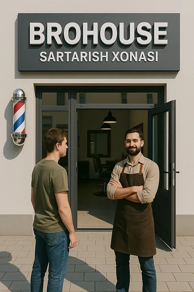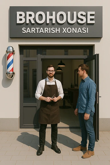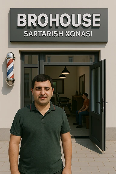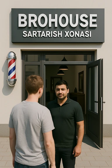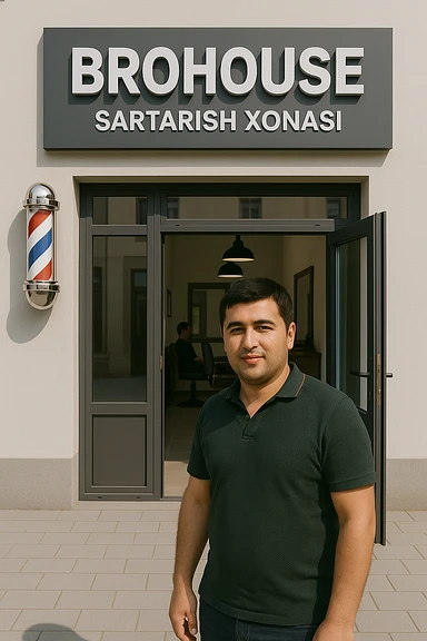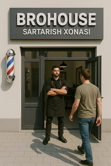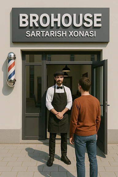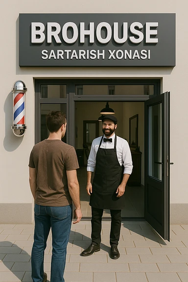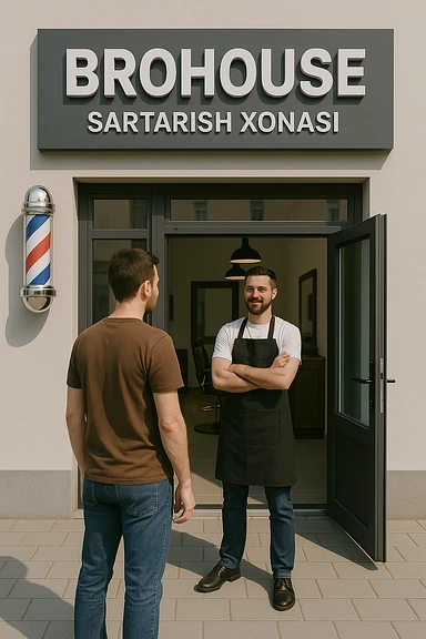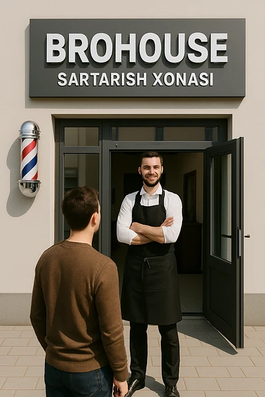 eni shu rasimga manashu odamga uxhshasin sartaosh eshik oldida tursin va tashqarida esa mijoz rasm esa 16 ga 9 bulsin 1920x1080
