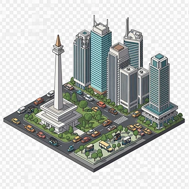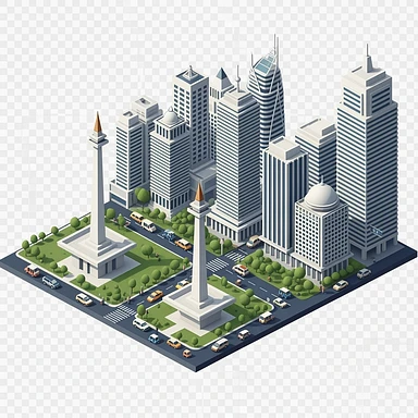 Isometric minimalistic illustration of Jakarta Monas (National Monument), Istiqlal Mosque, skyscrapers of Sudirman CBD, bustling streets with traffic and tuk-tuks, subtle 3D miniature effect and Tilt Shift effect, no cartoonish look, transparent background. emoji