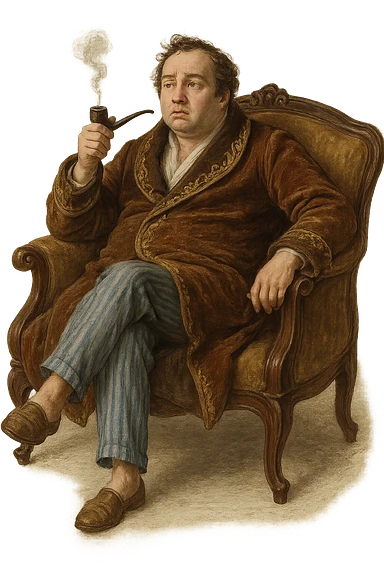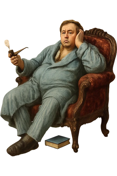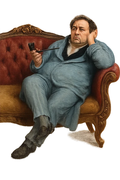 Герой Обломова в слегка рисованном, но при этом реалистичном и объемный стиле, со слегка растерянным видом в дорогом халате развалился на дорогой кушетке 19 века, прозрачный фон emoji