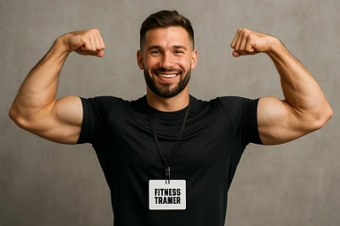 Fitness trainer shows the biceps at full length image | AI Emoji Generator