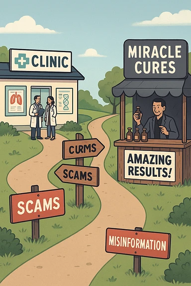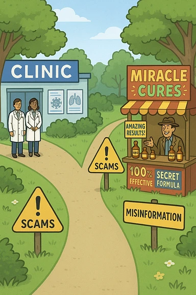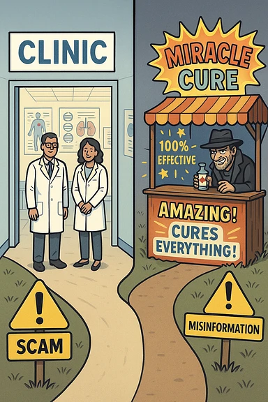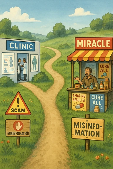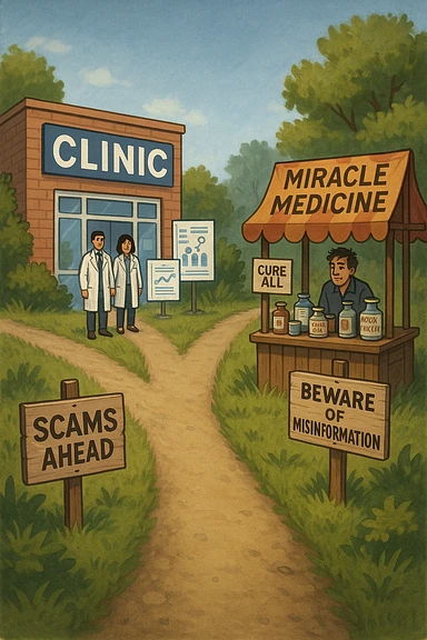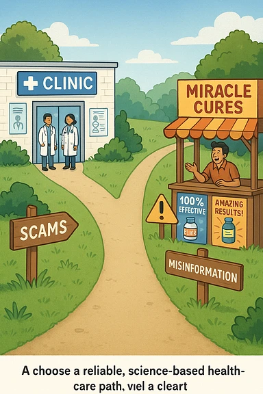 two paths diverge—one leads to a trustworthy clinic with doctors and scientific posters, the other to a shady stand selling “miracle” medicines with exaggerated claims. Signs along the second path warn of scams and misinformation. The scene encourages viewers to choose reliable, science-based healthcare. emoji