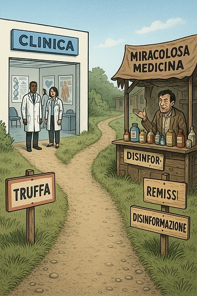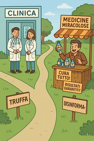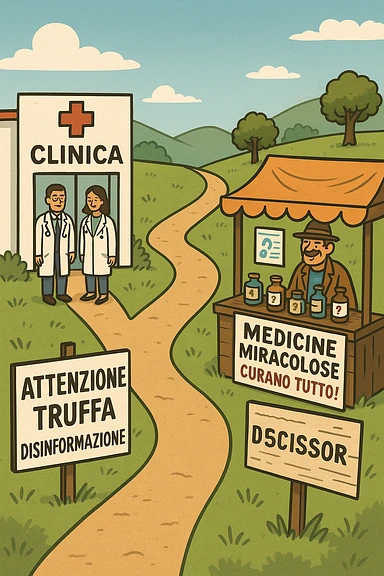 two paths diverge—one leads to a trustworthy clinic with doctors and scientific posters, the other to a shady stand selling “miracle” medicines with exaggerated claims. Signs along the second path warn of scams and misinformation. The scene encourages viewers to choose reliable, science-based healthcare. in italiano emoji