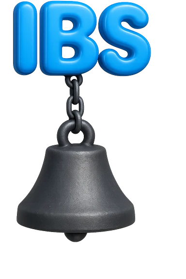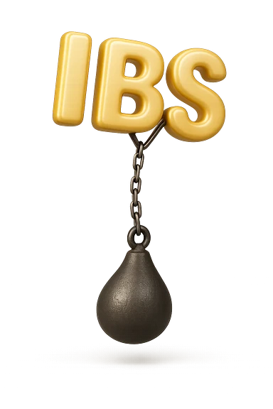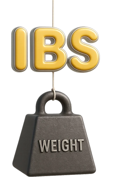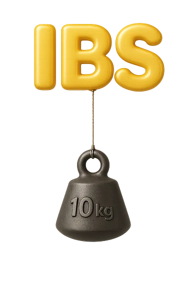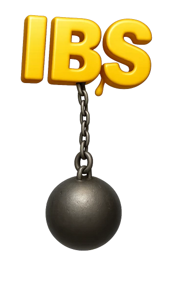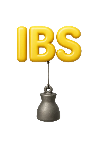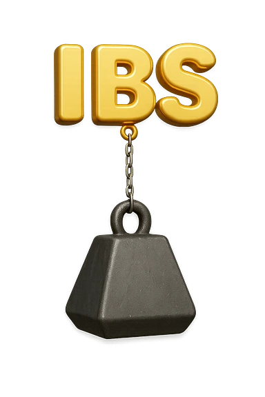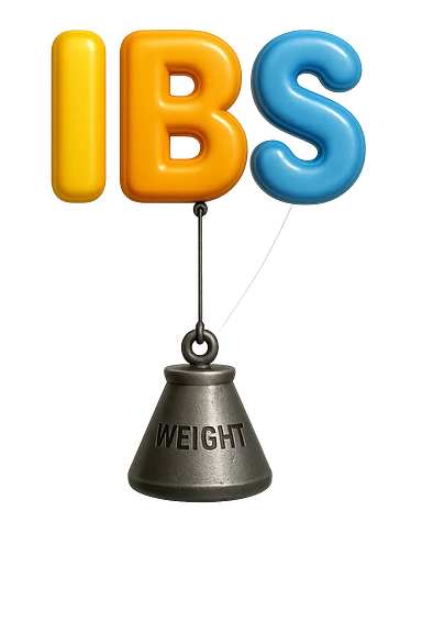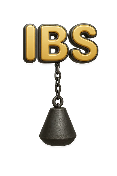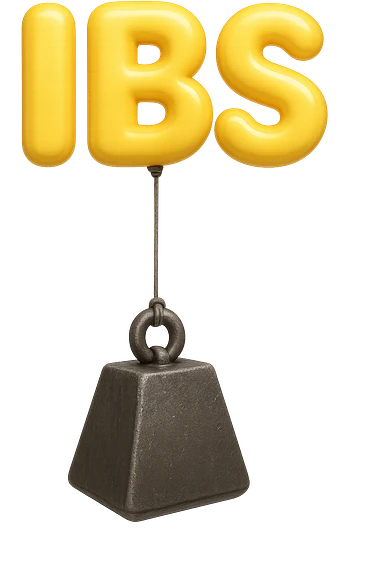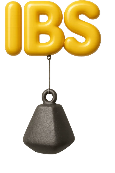 emoji stile iphone della parola "IBS" sospesa in aria con zavorra attaccata sotto che la fa cadere per il peso, iperrealistico 4k emoji