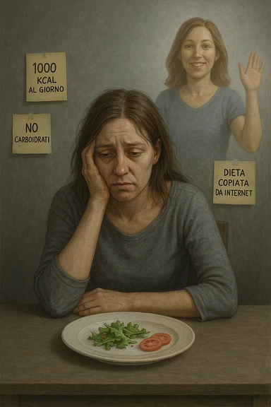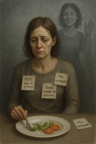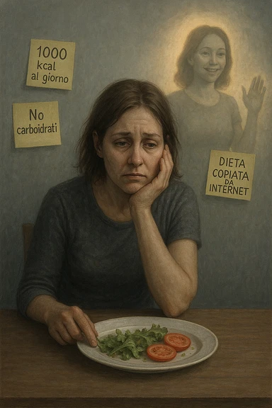 Donna tra i 30 e i 40 anni seduta a tavola, davanti a un piatto quasi vuoto con solo insalata e due fette di pomodoro. Il suo volto è visibilmente triste, stanco, con occhi spenti. Intorno a lei, foglietti attaccati con scritte come '1000 kcal al giorno', 'No carboidrati', 'Dieta copiata da internet'. L’atmosfera è fredda, grigia, priva di energia. Il suo corpo appare spento e scarico. Sullo sfondo, la sagoma di sé stessa più felice e piena di vitalità, come ricordo di un approccio migliore mai seguito. Stile realistico e simbolico emoji