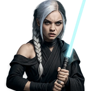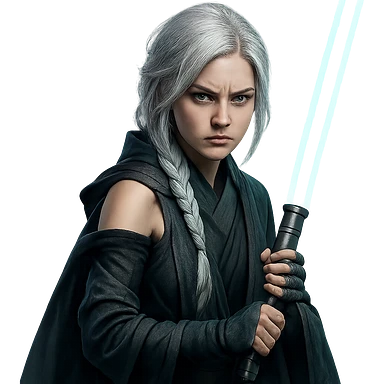 full body female Jedi holding a lightsaber high above her head in a heroic stance, glowing lightsaber, futuristic setting image | AI Emoji Generator