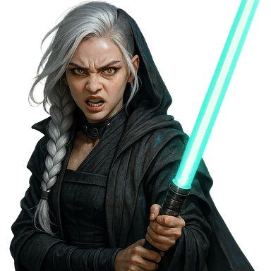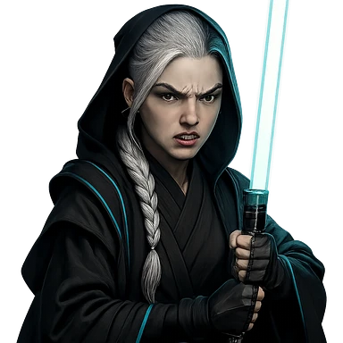 a closeup portrait of young woman with gold yellow eyes, white hair, long braid, black off-shoulder top, punk gothic style, futuristic cyberwave cyberpunk, jedi attire and posture robes of a padawan, foreweilding a bright blue-green lightsaber, angry fierce face expression, power stance, 30-90 emoji