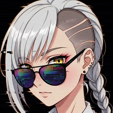 cyberwave glitch digital microscanner projection of a portrait of an anime girl wearing dark shades, cyber hologram, abstract, experimental glitchy brutalist graphicwave, 1 female, white hair mohawk locks, shaved sides hair, long single braid, gold yellow eyes, style of anime emoji