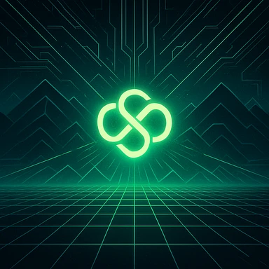 futuristic neon digital artwork with symmetrical layout, central glowing logo resembling an abstract knot or infinity symbol emitting bright green light, background with grid pattern on lower half, upper half with stylized mountain shapes, geometric lines and patterns in green and blue, radiating lines from logo, sense of depth and movement emoji