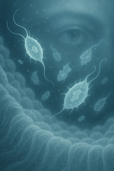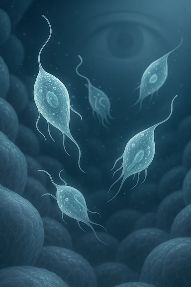 A detailed macro-style image of a translucent human intestinal wall under extreme magnification. Floating nearby are multiple protozoa — small, semi-transparent, shapeshifting organisms with flagella or cilia, glowing faintly under the microscope. In contrast, a faded overlay silhouette of a human eye is shown in the background, symbolizing how these organisms are invisible to unaided vision. The scene is softly lit with cool bluish tones, evoking a clinical and microscopic atmosphere. Focus is hyper-sharp on the protozoa, with blurred organic tissue textures in the background. Educational yet haunting, it shows how much remains unseen inside the body emoji