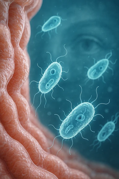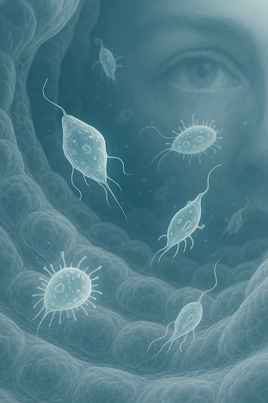 A detailed macro-style image of a translucent human intestinal wall under extreme magnification. Floating nearby are multiple protozoa — small, semi-transparent, shapeshifting organisms with flagella or cilia, glowing faintly under the microscope. In contrast, a faded overlay silhouette of a human eye is shown in the background, symbolizing how these organisms are invisible to unaided vision. The scene is softly lit with cool bluish tones, evoking a clinical and microscopic atmosphere. Focus is hyper-sharp on the protozoa, with blurred organic tissue textures in the background. Educational yet haunting, it shows how much remains unseen inside the body emoji