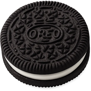 Make the sandwich cookie look even more like an Oreo: two very dark chocolate wafers with detailed, classic Oreo-style embossed pattern, thick white cream layer in between, clean edge, slight gloss on the cream. No bite, no packaging, just the whole cookie. Apple emoji style, soft lighting, subtle shadows, emoji scale. Transparent background. emoji
