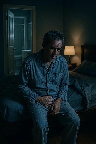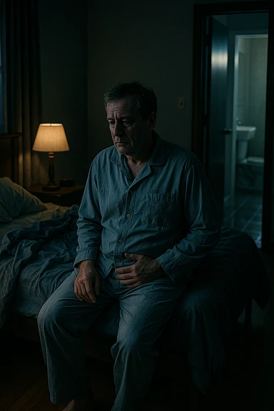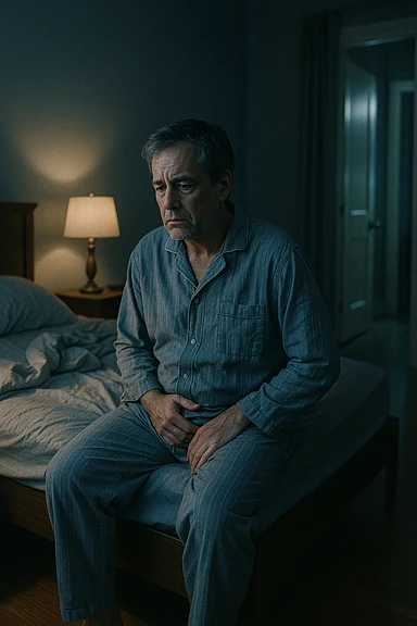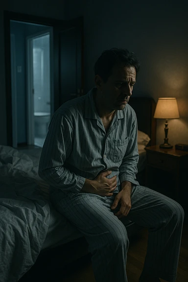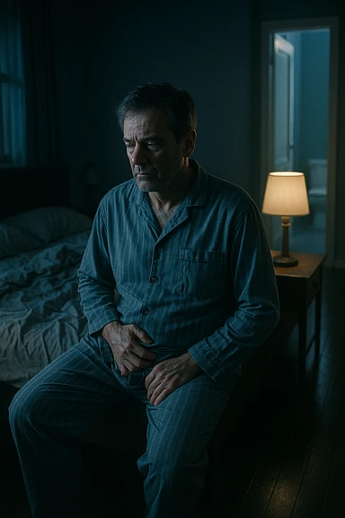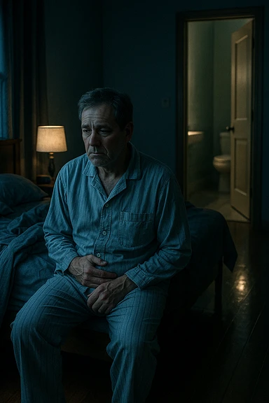 A nighttime scene inside a dimly lit bedroom. A man in his 50s sits stanco sul bordo del letto, con lo sguardo perso nel vuoto, mentre una luce fioca proviene dalla lampada sul comodino. Indossa un pigiama spiegazzato, e si tiene leggermente la zona bassa dell’addome. Dietro di lui, il letto è visibilmente disfatto, segno di sonno interrotto. Una porta socchiusa sullo sfondo mostra la luce accesa in bagno, con il pavimento riflettente che indica i numerosi passaggi notturni. Il tono è cupo ma realistico, con colori freddi, blu e grigi, e un leggero bagliore lunare che filtra dalla finestra. Stile: 35mm film, profondità emotiva, dettaglio ambientale. in italiano emoji