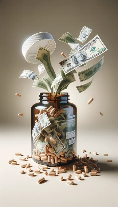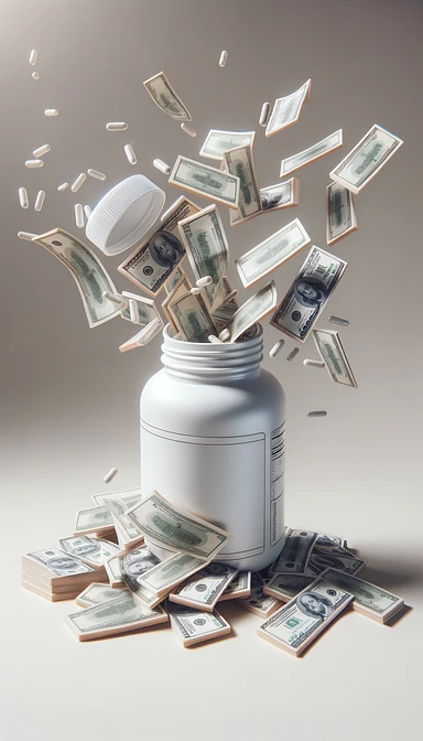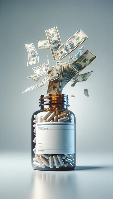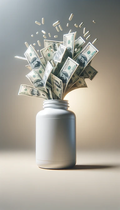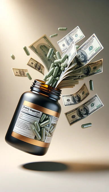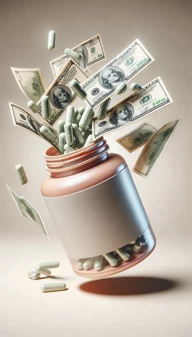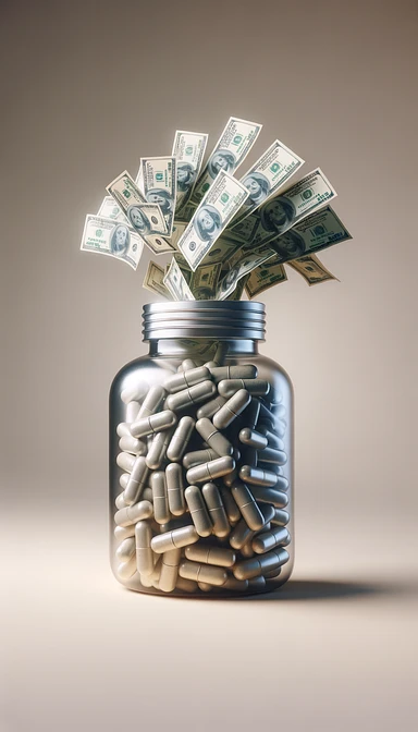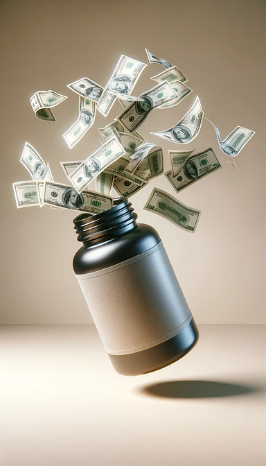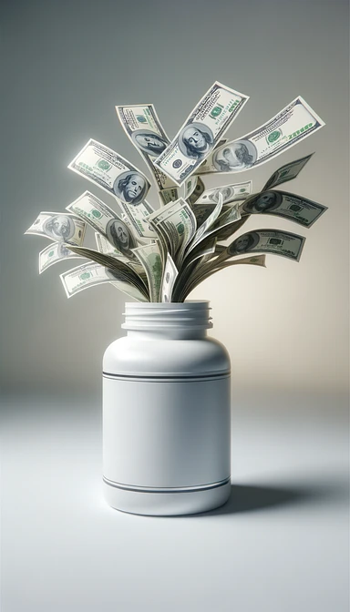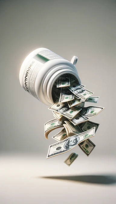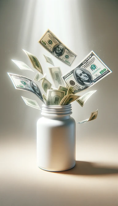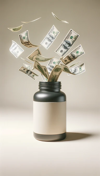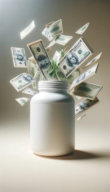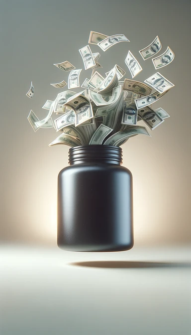 boccetta di integratore fluttua in aria, dalla boccetta aperta escono delle banconote, sfondo neutro chiaro, iperrealistico 4k emoji