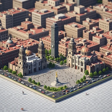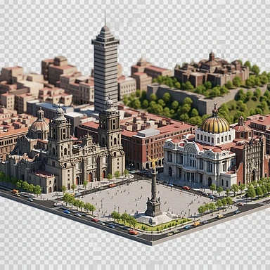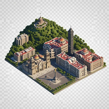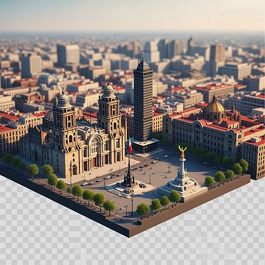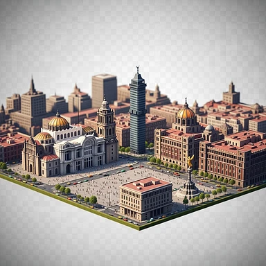 Isometric diorama of Mexico City iconic landmarks: Zócalo square with Metropolitan Cathedral, Palacio de Bellas Artes, Torre Latinoamericana, Chapultepec Castle, and Angel of Independence, atmosphere of the city 3D miniature effect and Tilt Shift effect, no cartoonish look, transparent background. image | AI Emoji Generator