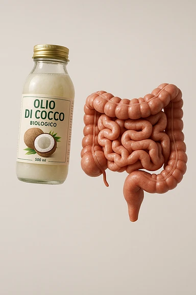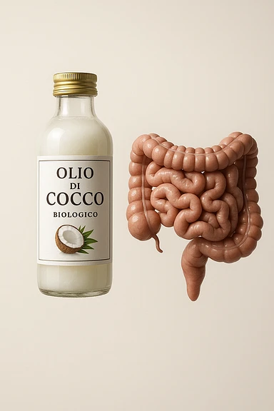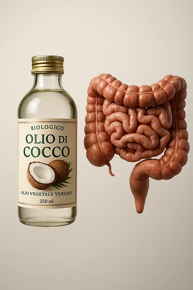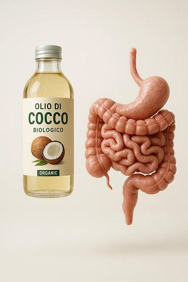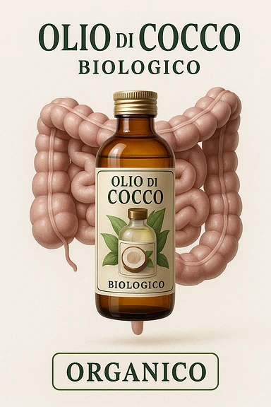 jar of coconut oil with Italian label 'Olio di Cocco', clear symbols of anti-dysbiotic and antifungal action (bacteria and fungi crossed out), realistic and cinematic style, vertical 2:3 aspect ratio, no other text. image | AI Emoji Generator