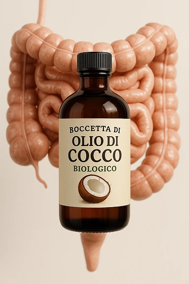 jar of coconut oil with Italian label 'Olio di Cocco', clear symbols of anti-dysbiotic and antifungal action (bacteria and fungi crossed out), realistic and cinematic style, vertical 2:3 aspect ratio, no other text.image