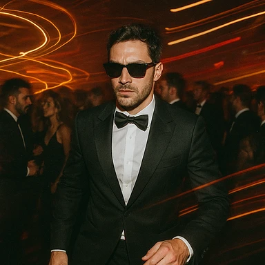 Create a photo inspired by the reference image of a man in stylish streetwear or a fitted tuxedo jacket and sunglasses, moving through a packed nightclub with a focused expression. The scene includes a sharply dressed crowd, motion blur, long exposure light trails with yellow-orange streaks, gritty camera texture, and raw chaotic energy. The image should be in 4K resolution. emoji