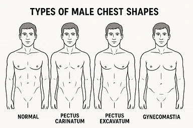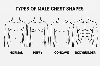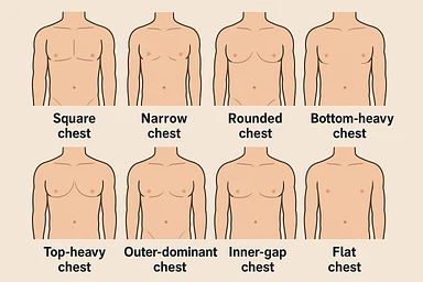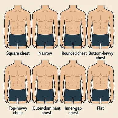 Make image of types of male chest shapes, few examples: Square chest, Narrow chest, Rounded chest, Bottom-heavy chest, Top-heavy chest, Outer-dominant chest, Inner-gap chest, Flat chest.