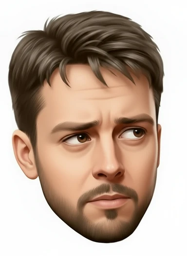 нарисуй точно такого же человека, с такой же эмоцией, но голова повернута в противоположную сторону, на право относительно зрителя,, пробор на голове как в оригинале, без фона emoji