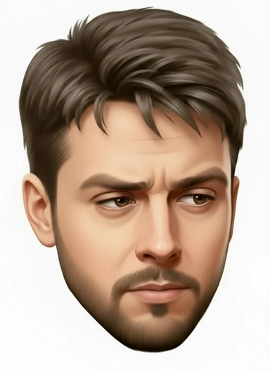 нарисуй точно такого же человека, с такой же эмоцией, но голова повернута в противоположную сторону, пробор на голове как в оригинале, без фона emoji