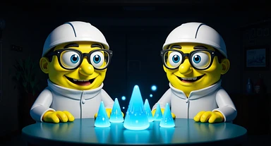 3D cienmatic cartoon shot, spongebob and patric dress in safety glasses and safe white outfit, the are standing front of table with blue crystals on table glowing (light source) science room in basement, back light, Cinema 4d render, proffesional lightning emoji
