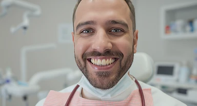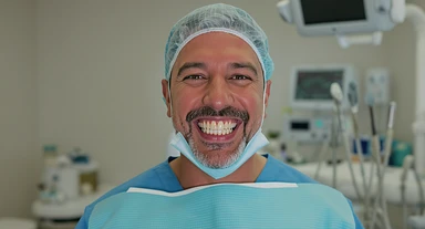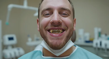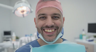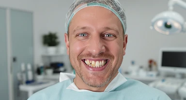 dentist smiling to camera with ugly teeth (bad and yellow teeth), cinematic shot, minimalistic clinic in background emoji