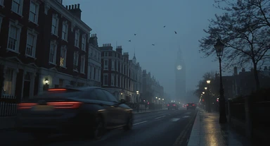Cinematic shot of a london street, cloudy foggy day, soft light, car flying, leading lines to big ben in distance, multi composition, in foreground blurred car, on second street around UK bulding, od another plan in distance big ben, birds flying, artistic look, captured on arri alexa 35, blue hour emoji