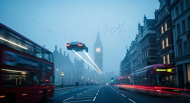 Cinematic shot of a london street, cloudy foggy day, soft light, car flying, leading lines to big ben in distance, multi composition, in foreground blurred car, on second street around UK bulding, od another plan in distance big ben, birds flying, artistic look, captured on arri alexa 35, blue hour emoji