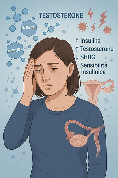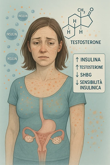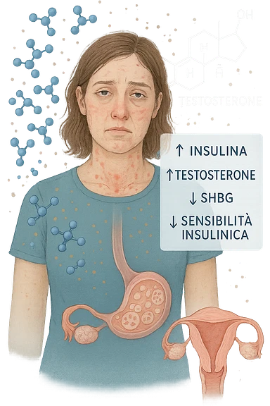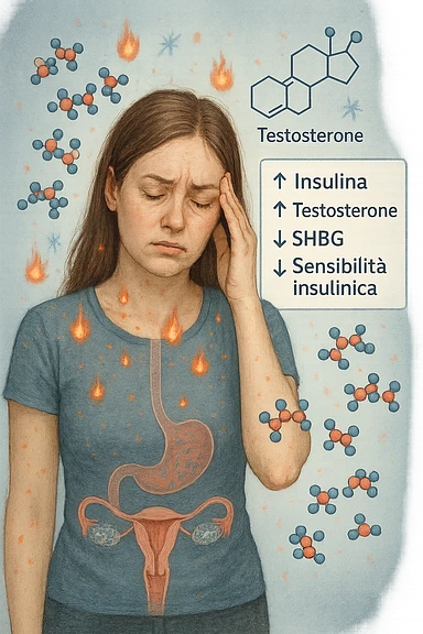 Donna tra i 25 e i 35 anni in primo piano, con espressione affaticata. Intorno al suo corpo appaiono in modo stilizzato e simbolico squilibri ormonali: molecole di insulina in eccesso fluttuano attorno, androgeni (testosterone) evidenziati sopra la testa, segnali visivi di infiammazione cronica lieve. Sopra le ovaie (visibili in trasparenza) compaiono piccole cisti multiple. Accanto a lei, un diagramma stilizzato mostra: '↑ Insulina', '↑ Testosterone', '↓ SHBG', '↓ Sensibilità insulinica'. L’atmosfera è scientifica, educativa ma empatica. Stile realistico con elementi infografici fluttuanti e colori freddi ma puliti. in italiano emoji