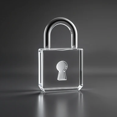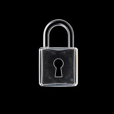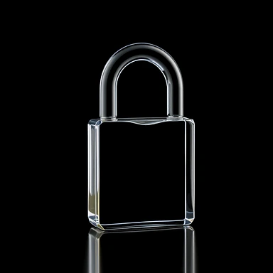 Photo of a 3d made of glass padlock, black void around symmetrical 3d render, rim light emoji
