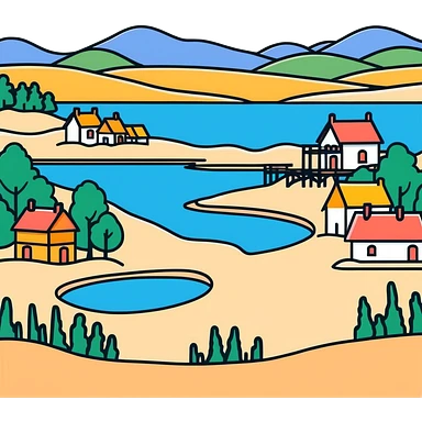 Samogitian flags on a forested landscape with many lakes and a sandy coastline with sand dunes and cute colourful wooden villages emoji