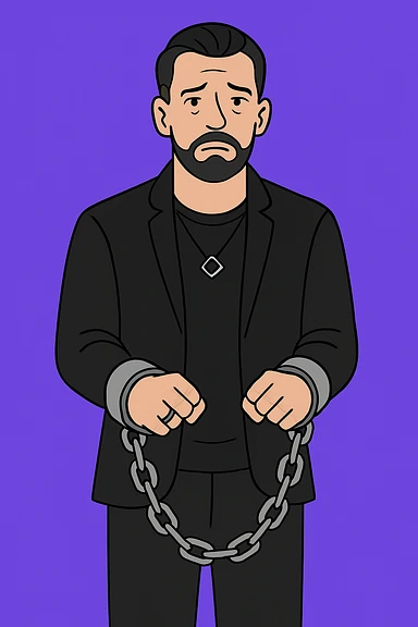 Используя такую стилистику как на картинках сгенерируй мужчину в одежде как на фото. Он стоит и расстроенно смотрит на зрителя, на его руках кандалы и цепи, которые тянут его вниз emoji