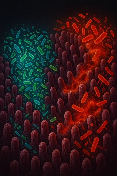 Scientific visualization. A damaged, inflamed section of intestinal lining. A miniature, glowing clove is positioned like a healer, sending out tendrils of golden energy that soothe the inflammation and weave the cellular barrier back together, creating a healthy, sealed surface.image