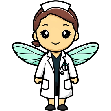 A cute female, dragonfly that’s a scientist wearing a lab coat emoji