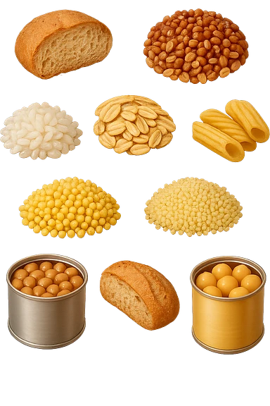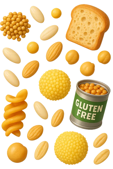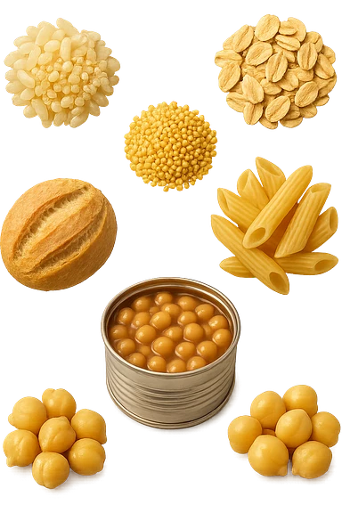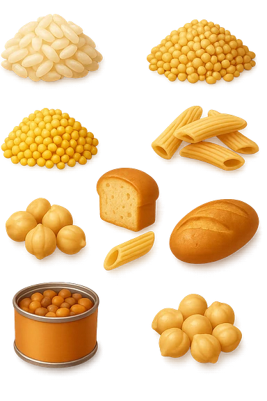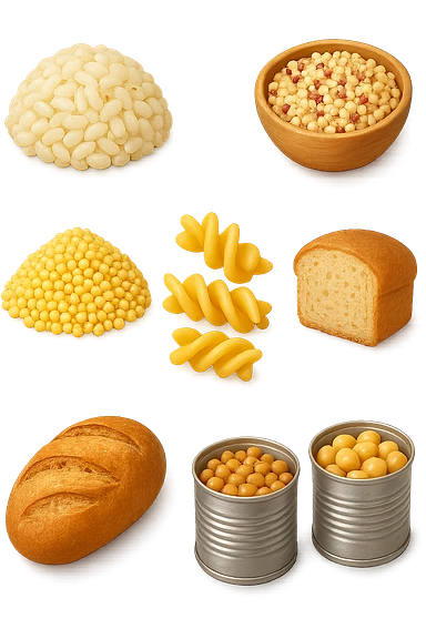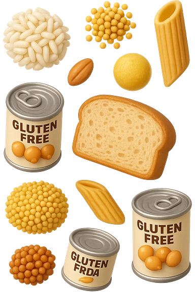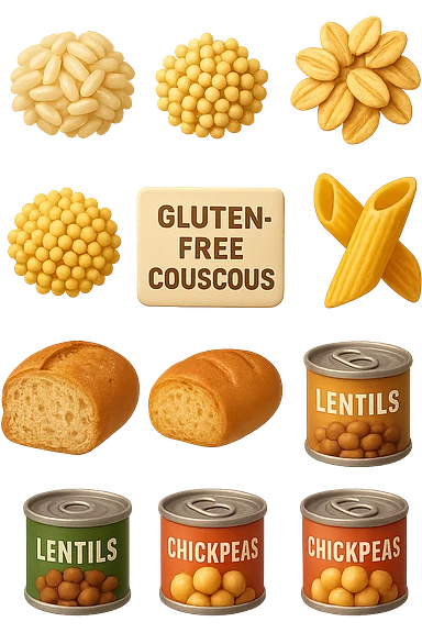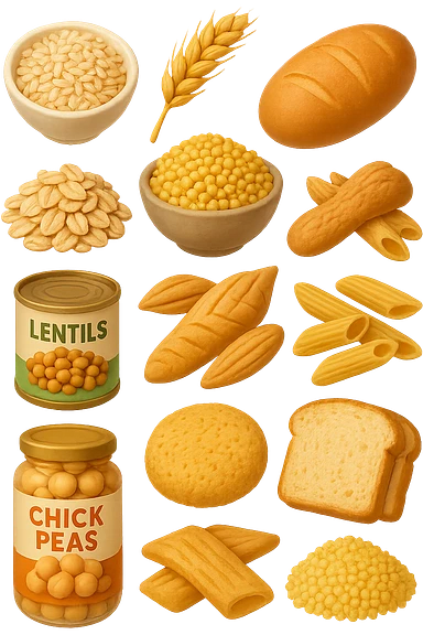 emoji stile iphone 3d di questi elementi che fluttuano in aria: Riso, quinoa, avena, miglio, couscous senza glutine Pasta e pane gluten-free Farro a lievitazione lunga Lenticchie e ceci in scatola che fluttuano in aria, iperealistico 4k emoji