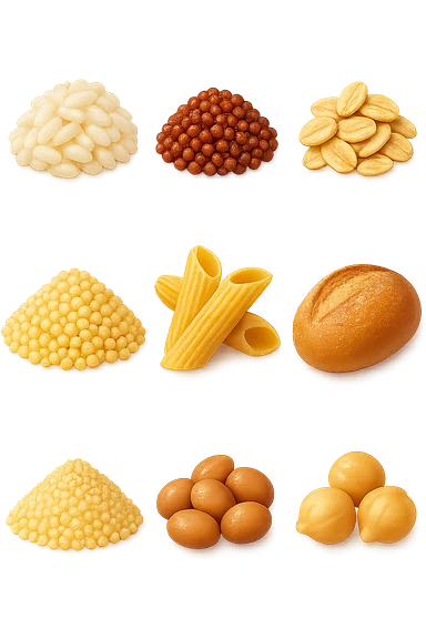 emoji stile iphone 3d di questi elementi che fluttuano in aria: Riso, quinoa, avena, miglio, couscous senza glutine Pasta e pane gluten-free Farro a lievitazione lunga Lenticchie e ceci in scatola che fluttuano sparse casualmente in aria, iperealistico 4k emoji