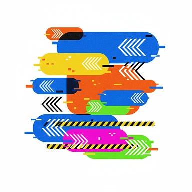 a graphic design wallpaper with various sizes of brightly colored glitchy oblong rectangles, various repeating stylized arrows, and caution bars stripes - neobrutalist glitchpunk linear, perfect angles, SPARSE MINIMALISM emoji