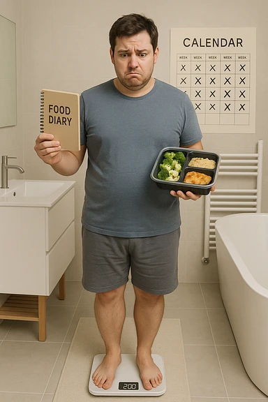 Uomo sulla trentina in piedi su una bilancia in bagno, con espressione delusa e confusa. In mano tiene un diario alimentare e un contenitore per i pasti già preparati, segno che sta seguendo una dieta. Dietro di lui un calendario con settimane segnate, ma senza cambiamenti. Il suo corpo appare identico a prima, senza progressi visibili. La bilancia digitale mostra lo stesso numero. Ambientazione pulita e moderna, toni neutri. Atmosfera di frustrazione e demotivazione, luce soffusa. emoji