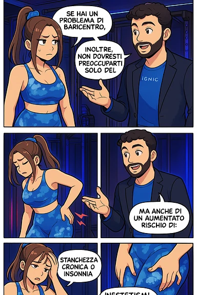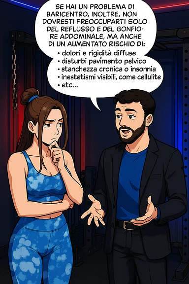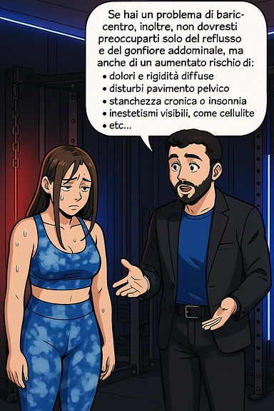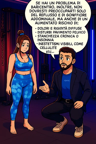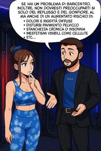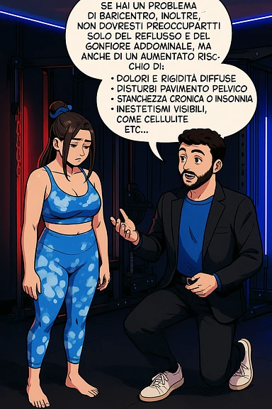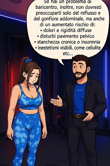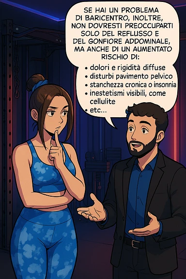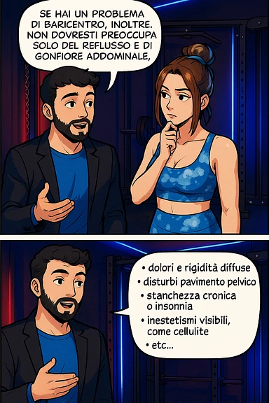 TRASFORMA QUESTO CAROSELLO IN UN FUMETTO STILE WEBTOON/MANGA A COLORI CON QUESTE DUE PERSONE IDENTICHE CHE INTERLOQUISCONO TRA LORO, L'uomo sta spiegando alla donna questo concetto MENTRE LA DONNA SI TIENE la mano sulla fronte sconcertata: LUI (UOMO): Purtroppo, la maggior parte dei medici ignora queste connessioni e prescrive farmaci antiacidi e inibitori di pompa, anche quando si potrebbero evitare. Il mio è il primo e unico percorso che lavora sul reflusso con un lavoro mirato sul baricentro; image | AI Emoji Generator