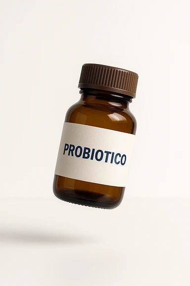 boccetta di probiotico con la scritta "PROBIOTICO" sull'etichetta fluttua in aria, realistica 4k sfondo bianco emoji