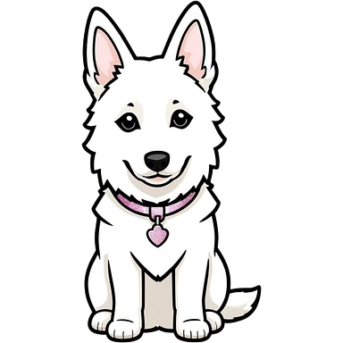 white Swiss Shepherd dog with a Glitter collar . ober the Dog ist a heart emoji