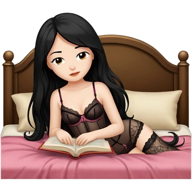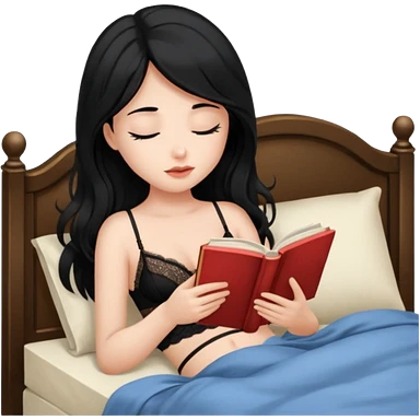 Girl black long hair reading book sleepy bed lingerie emoji