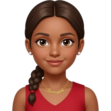 Make a girl that looks real and not 100% AI generated. A girl with light brown skin with low ponytail put it in front. She has pearl earrings and a necklace that says ‘Thenujah’ in cursive gold. She is skinny make her face a v shape. She is wearing red. She is 12 years old. emoji