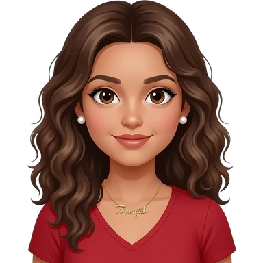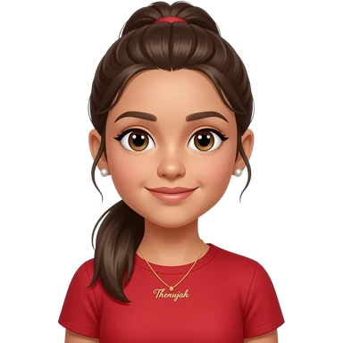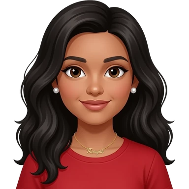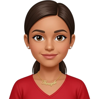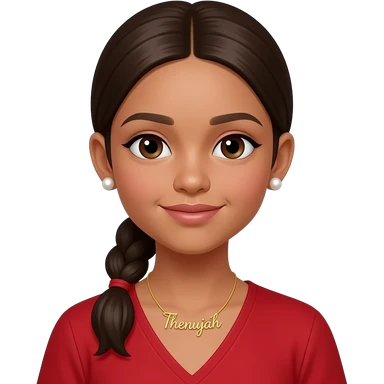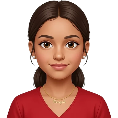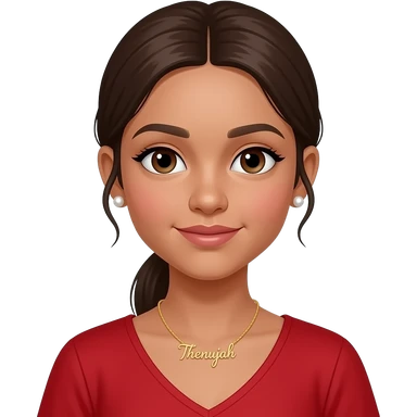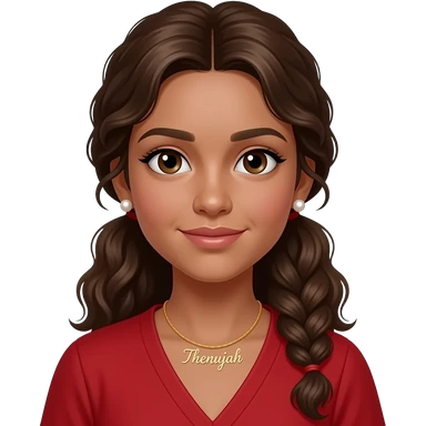 Give me a girl with light brown skin black long hair, a nice nose and lips she is wearing pearl earrings and a necklace that says ‘Thenujah’ in cursive gold. She is wearing a red shirt and her hair is wavy and straight emoji