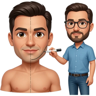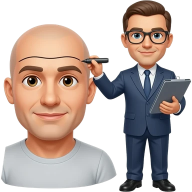 Hair transplant doctor with skin marker and patient sitting and waiting hairline desing.Make patient head bold and there must be line.Doctor shouldnt wear glasses and white jacket emoji