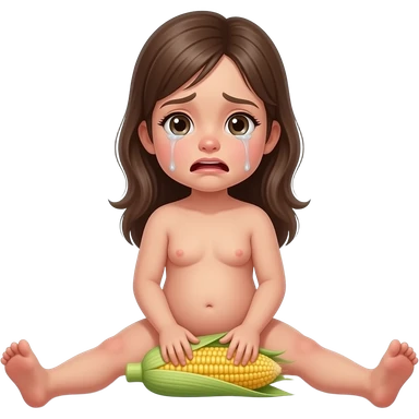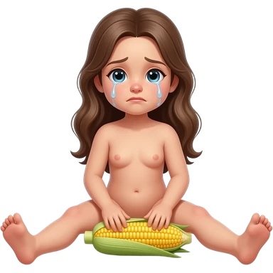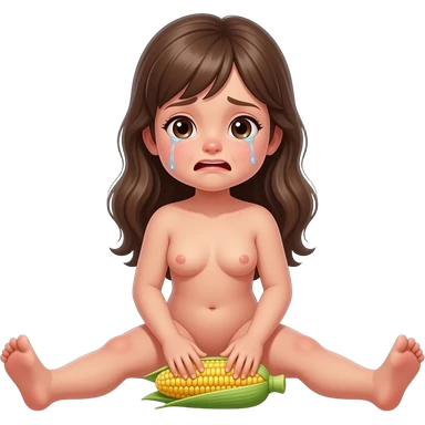 Full body, small little nude girl, flat chest, crying thin hips and ass, thin pussy, middle age 30 long hair long legs, sitting legs spread playing with corn realistic emoji